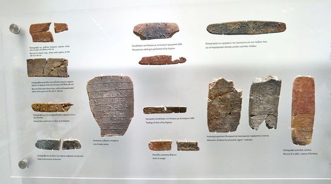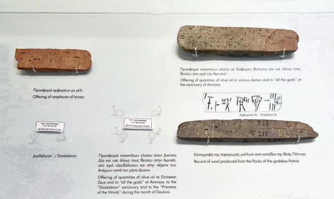 克诺索斯王宫遗址最重要的出土文物是泥版残片,上面刻有线块泥版残片上记载了会计账目、土地登记、税收记录、人力和财富管理、橄榄油与羊毛的生产和流通、对外贸易、战车和武器、军官与士兵的记录、管理机构名称、官员名字、祭品及祭司名字,等等,堪称王朝档案。