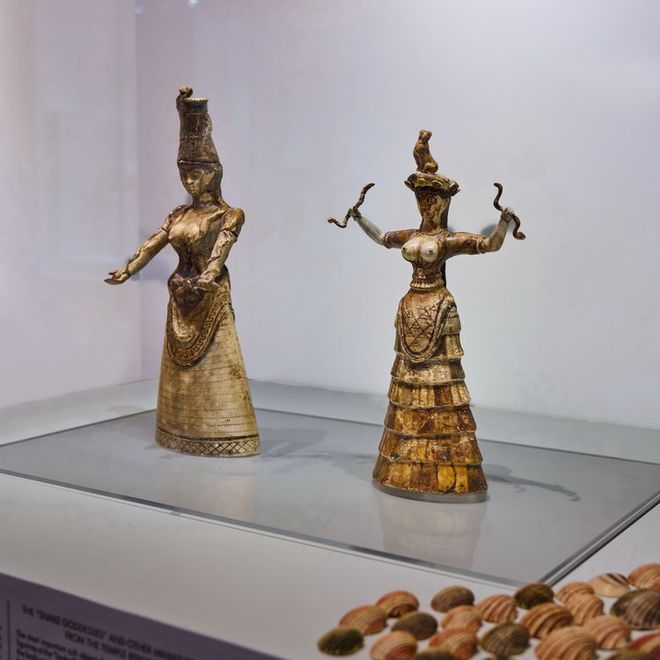 一女神双手持蛇,另一女神双臂缠蛇。蛇象征生育与繁衍。猫科动物蹲坐头顶,表示着女神对野生动物的统治。