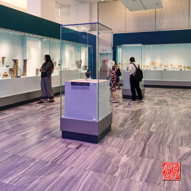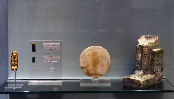 右是花岗岩“马泽尔”雕像(残缺),有铭文标识:埃及中王国,公元前22~17世纪。克诺索斯王宫遗址出土。