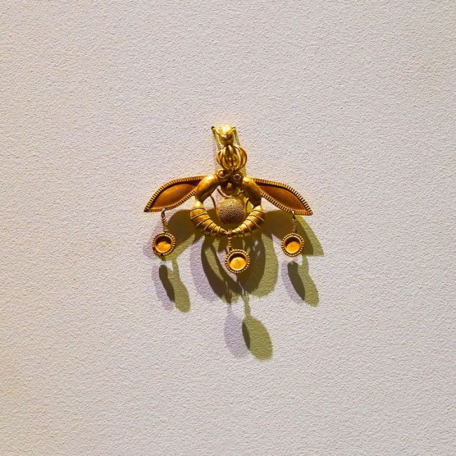 两只黄金小蜜蜂叼着一滴蜂蜜,头上是装有金珠的金丝笼,两腿夹着圆形蜂窝,两翅膀和尾部悬挂小圆盘。身上有多圈细腻的花环。