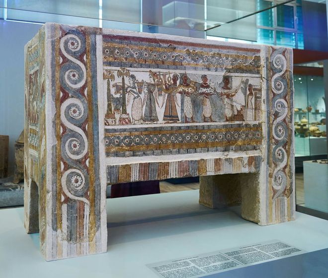 正面是葬礼情景。右边身穿长袍的逝者在大型坟墓前接受船模型和动物的祭品;左边女祭司在七弦琴伴奏下接受献酒,并把酒倒入两柱之间的桶里。