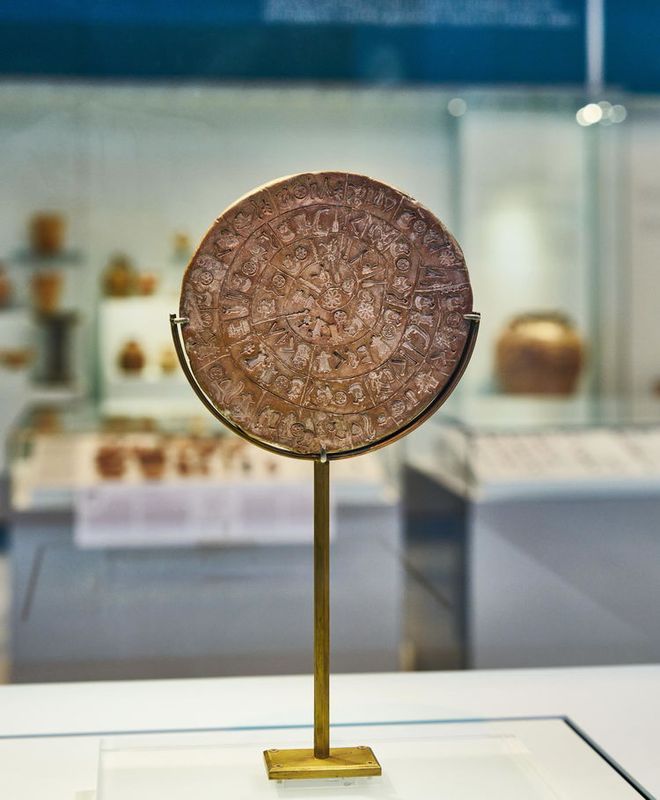 最为神秘的是一个直径15厘米的陶圆盘。圆盘两面分布241个印记共45种符号,如人形、鱼、鸟、昆虫、植物等。这些印记呈螺旋分布,用短线组,可能表示单词。