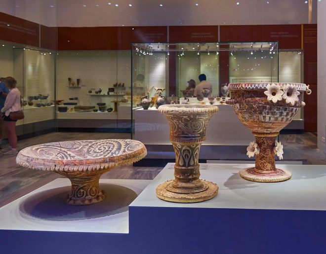 费斯托斯彩绘陶器色彩丰富,风格清新别致,绘满了棋盘、螺旋线条以及植物叶茎与花果图案,堆塑于器壁表面的百合花生栩栩如生。