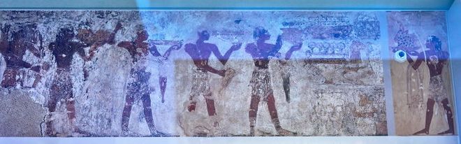 这是一幅壁画中的部分。女士们在蓝色海洋背景下穿戴奢华,黑发卷曲,颈部佩戴珠宝项链,举手展示珠宝手链,姿态优雅,既高雅又稍显。杏彩体育官方app下载